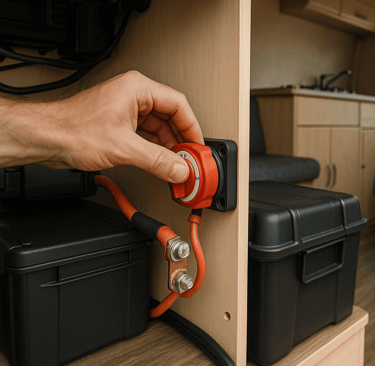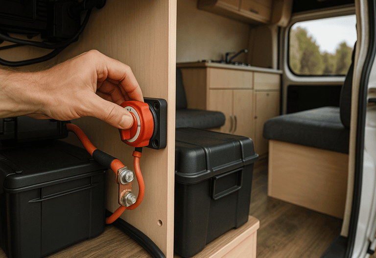 Un interruptor de corte (o desconectador de batería) permite interrumpir por completo el paso de corriente desde la batería hacia el sistema eléctrico de la camper. Es como poner un "botón de apagado total" que te asegura que no hay consumos fantasmas drenando energía mientras no estás usando el vehículo.