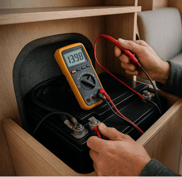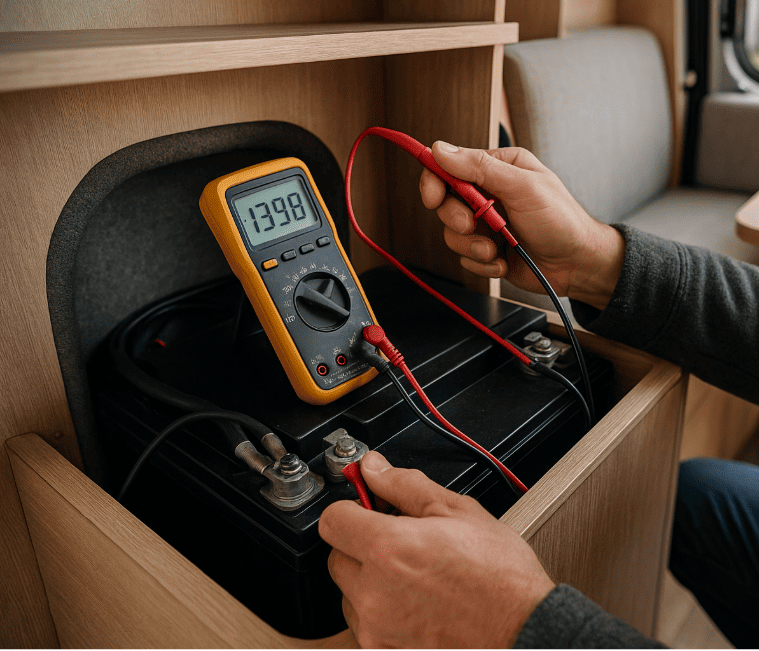 Con la furgoneta parada y sin consumos, la tensión debe caer suavemente a unos 12,4–12,6 V. Luego, arranca y vuelve a medir: en menos de 10 min debería subir a >13,5 V. Si no pasa, hay algo mal en carga, ya sea alternador, cableado o regulador.